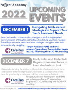 In collaboration with CarePlus, the Parent Academy will be presenting two evening workshops during the month of December. We hope you will join us!