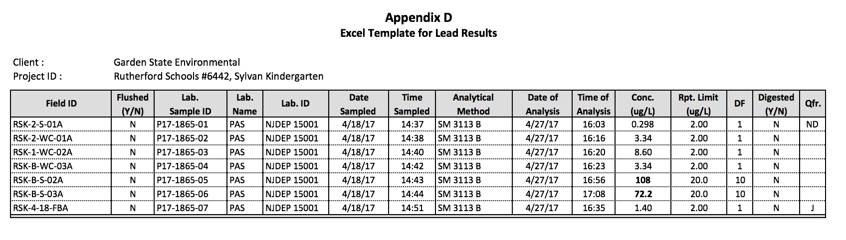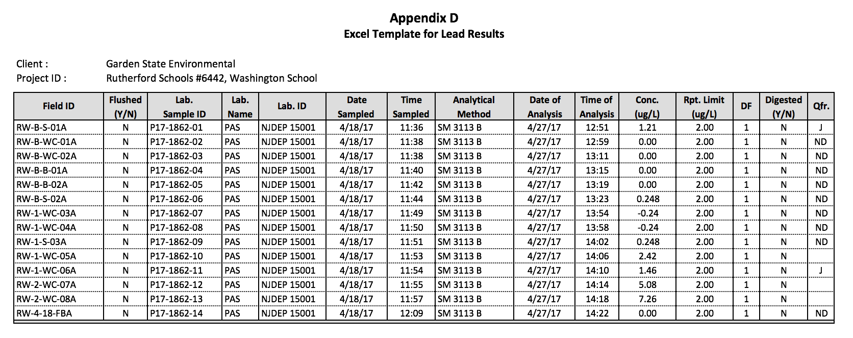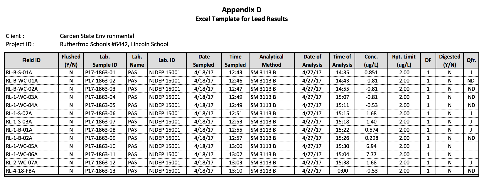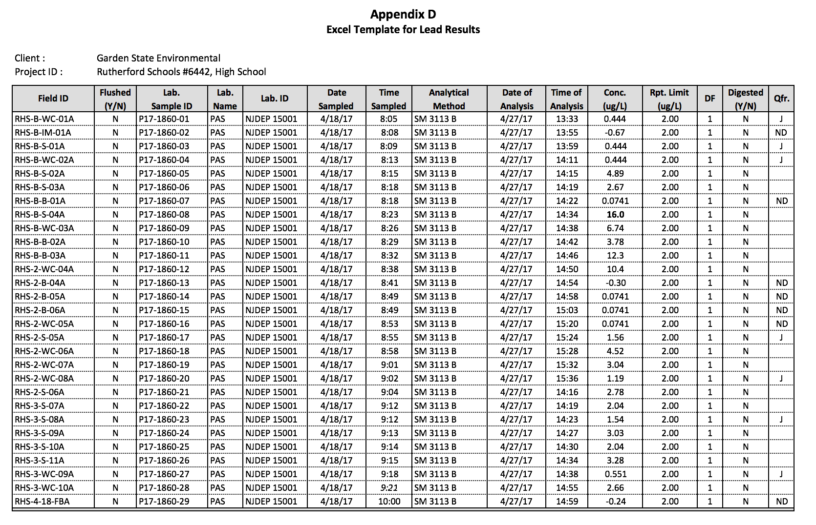 Garden State Environmental (GSE) tested the District’s water on April 18. Last year, GSE had also tested all sources of drinking water in the District and found that all samples were well below acceptable limits of lead. This year we expanded our test to include areas in each building not normally used as a source of drinking but which students or staff could conceivably access. Six locations in the district had lead particles above the threshold of 15 parts per billion. All other areas are below the threshold.