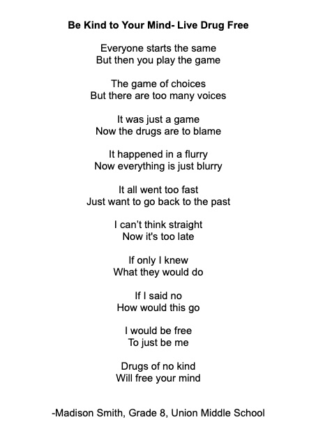 Congratulations to Union Middle School 8th grader Madison Smith on her winning entry into the Elks Drug Awareness Contest. Madison’s entry won not only the Rutherford competition, but the state competition as well! Her poem has moved forward to the national competition! Thank you to Mrs. Colleen Kiick for facilitating the entries from her classes at UMS and CONGRATULATIONS to Madison! Her winning poem is below.