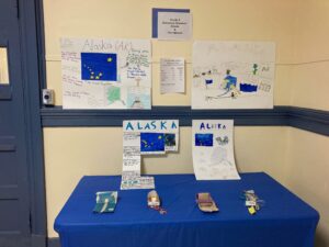 The grade 3 Discovery students recently completed a project based on Alaska’s Iditarod dogsled race. Students designed and built a dogsled out of “found” materials. They also created a poster with information about “The Last Frontier.” We all learned that the race start had to be changed from Anchorage to Fairbanks, due to a lack of snowpack. Finally, the sleds were tested, using a cup, string, and weights to move them across a smooth terrain (table) and a bumpy terrain. All the sleds survived the tundra!