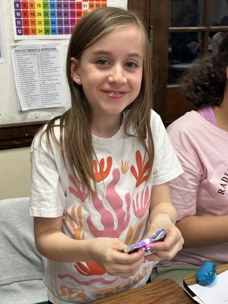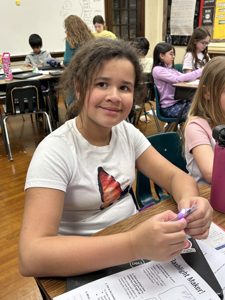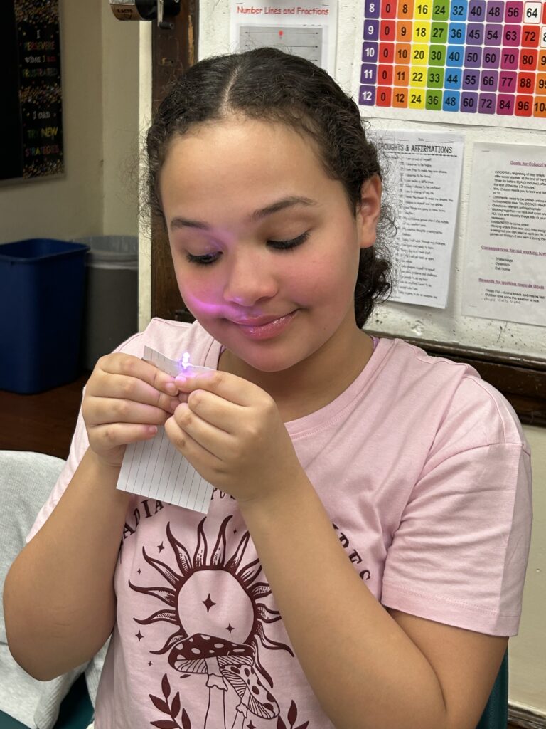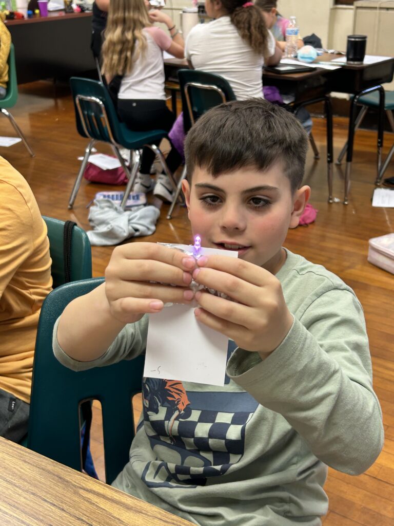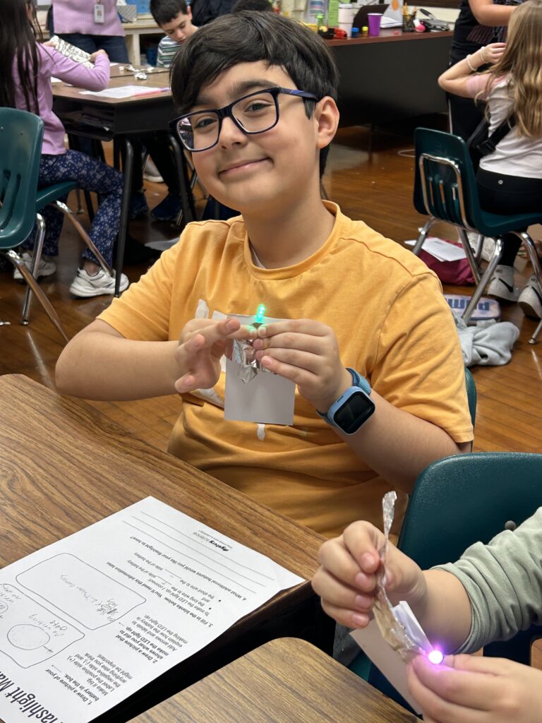 Students in Mrs. Colucci and Mrs. Barone’s 4th-grade science class are exploring the wonders of electricity! Using a battery and aluminum foil, they created circuits to power an LED bulb. When built correctly, the bulb lights up. You can see these happy faces also light up with pride in their success!