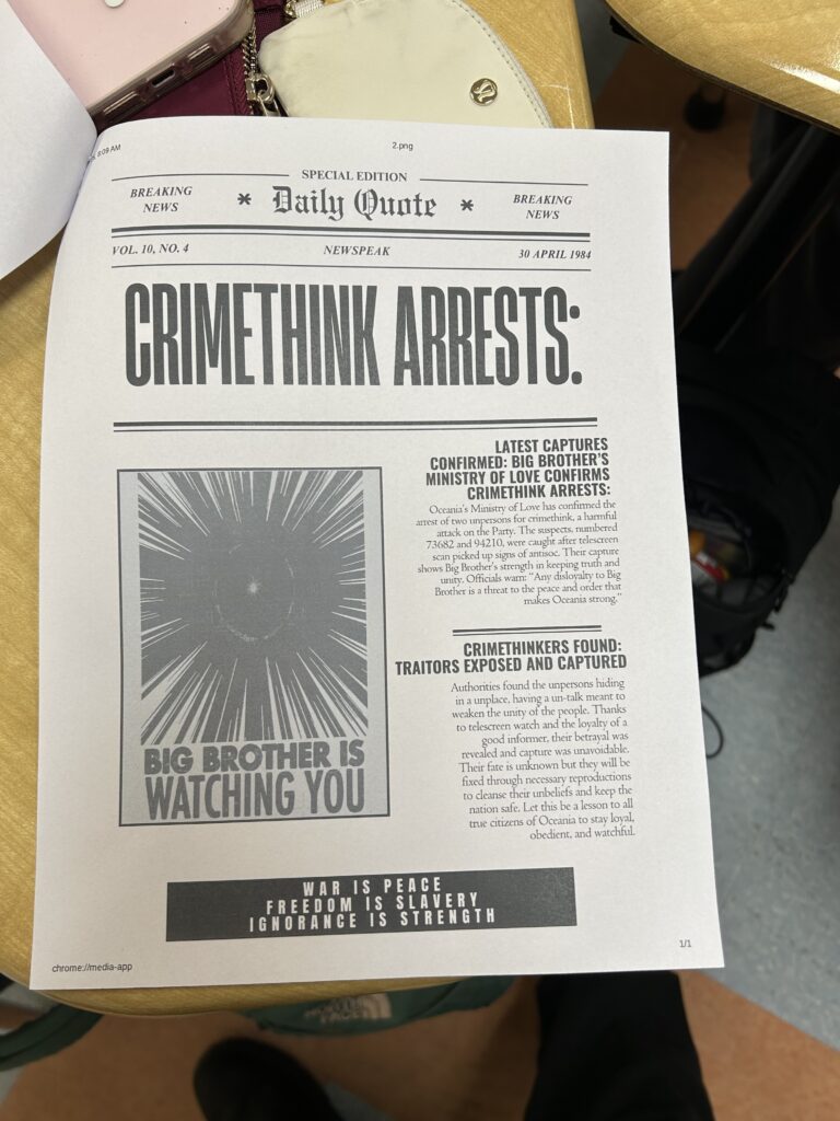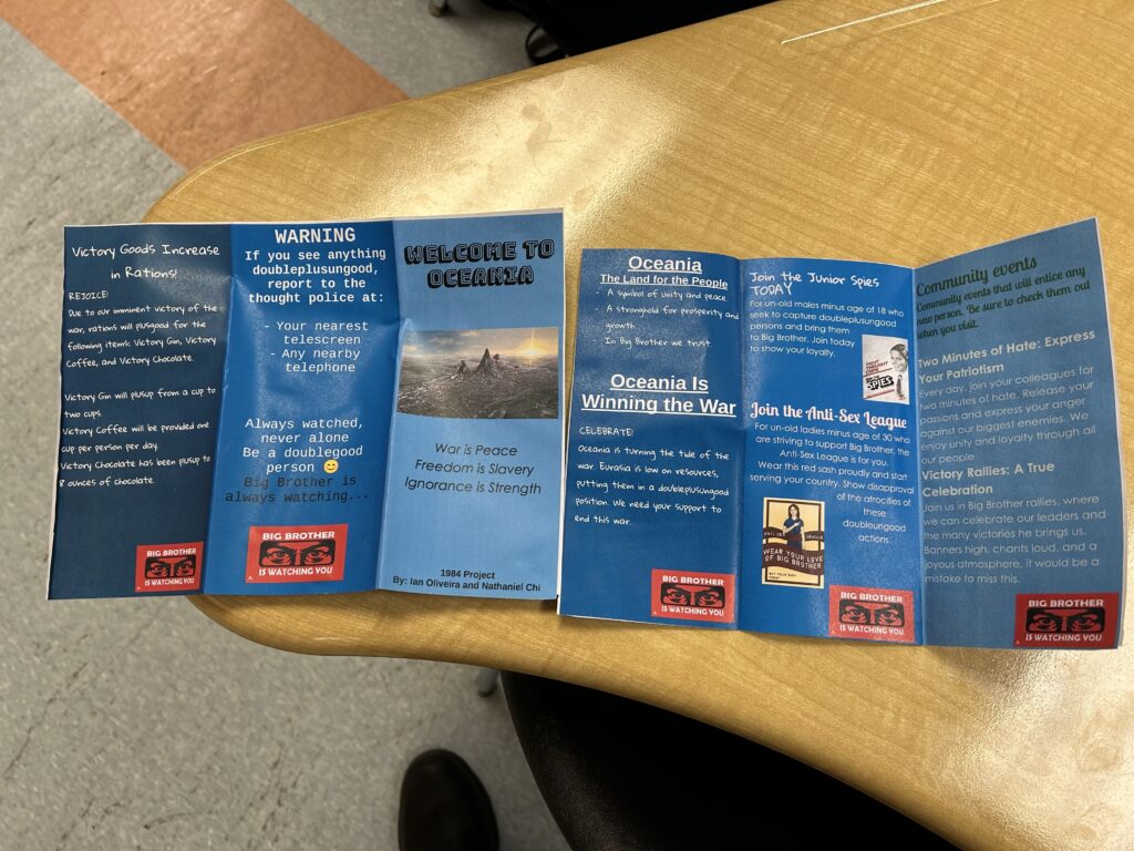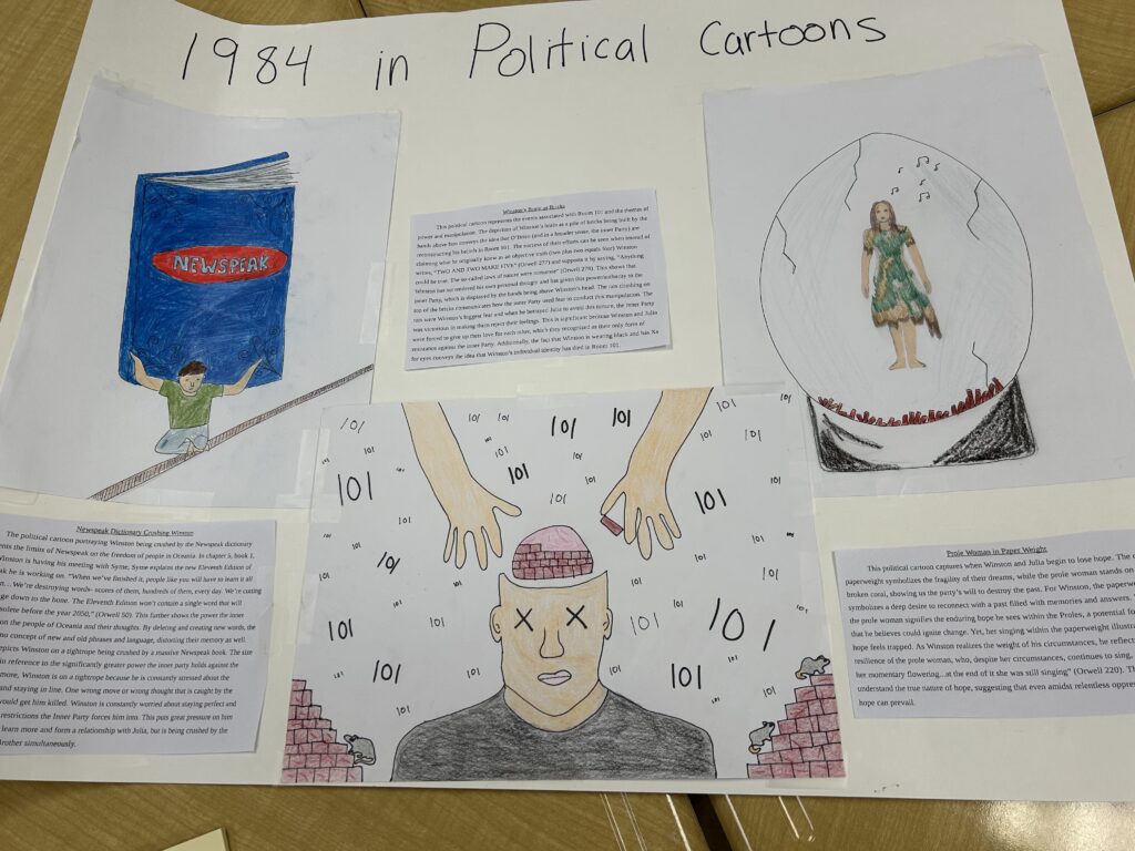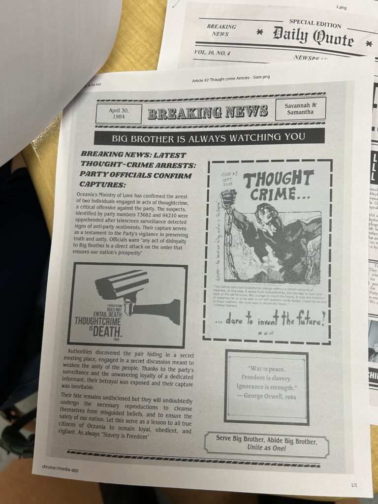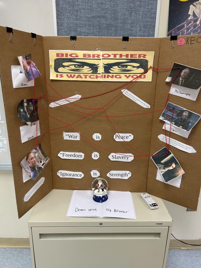 Mr. Stracco’s Honors English 400 class recently completed their unit on George Orwell’s 1984. As a culminating activity, students designed self-directed projects with corresponding rubrics aligned to NJLSA standards. Each group conducted a comprehensive analysis of the novel, focusing on its plot, themes, symbols, and key quotes. Projects ranged from student videos to newspaper articles, to recreations of scenes to explanations of the novel to the present day. They were the perfect mix of academic and creative!