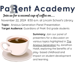 We hope you can join us Friday, 11/22 at 8:50 am, Lincoln School’s Library, for a Parent Academy Presentation exploring the benefits of a play-based childhood.