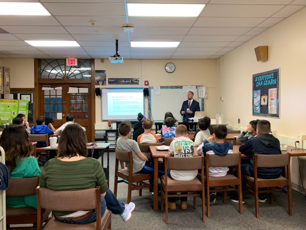 The sixth-grade students at Pierrepont school were thrilled to see Mr. Ersalesi, a teacher at Rutherford High School, talking about his second job as a 1010 WINS news anchor. Mr. Ersalesi was accompanied by his son, Henry Ersalesi, as he talked to the students. The students learned about what it is like to be on the radio and reporting the news. The students were enthralled to learn about the radio and the media business. Mr. Ersalesi explained the different platforms that the media have been moving to, such as YouTube, and what the future of news reporting can and will look like. He ended his session with a lesson about writing/English and how he needs to write articles everyday. The students were very interested in what Mr. Ersalesi was saying and learned how they may apply their skills from English class to a possible career in media.