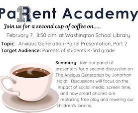 Please join us on February 7, 8:50 am at Washington School's Library for a second discussion on The Anxious Generation by Jonathan Haidt. Discussions will focus on the impact of social media, screen time, and how smart phones are replacing tree play and rewiring our children's brains. … [Read more...] about Parent Academy: Anxious Generation Panel Presentation, Part 2