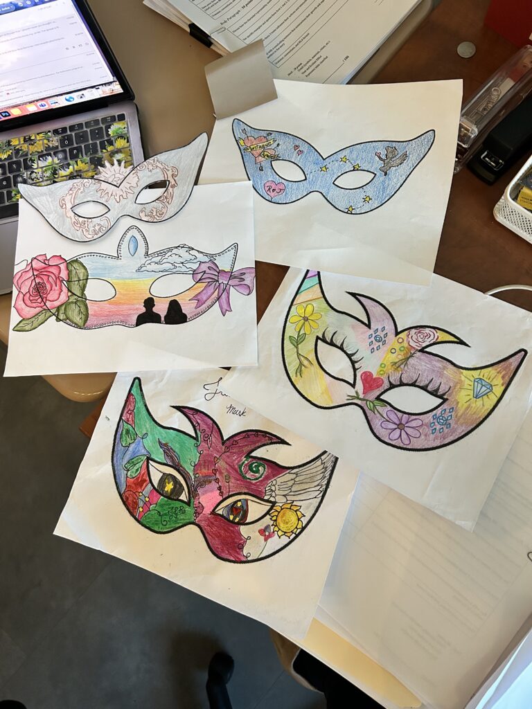 Students in Miss Barcenas’ and Ms. Garcia’s English 100 classes have been creating masquerade masks to coincide with their reading and analysis of William Shakespeare’s Romeo and Juliet. The key scene where the star-cross’d lovers first meet takes place at a masquerade party. Students have been taking notes of character traits and analyzing them. Once their list of traits allowed for a full character description, students completed artistic representations of those traits on their masks. Art projects like this are just one way that our teachers help students make connections with classical literature.