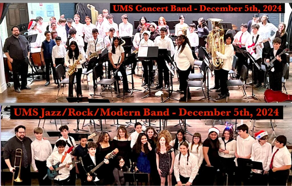 It was an exciting evening at the Union Middle School Winter Band Concert! The students did a fantastic job and it was also the debut of the brand new Jazz-Rock-Modern Band. The students really rocked the house with their takes on winter and holiday tunes! The UMS Band is under the direction of Mr. John Brigante. You can see both the UMS Band and Choir when they perform at the American Dream Mall on December 12, 2024! We hope to see you in the audience! The UMS Concert Band, UMS Concert Choir, UMS Jazz/Rock/Modern Band and other various ensembles/soloists will also be performing at the UMS Holiday Assembly on December 20th, 2024.