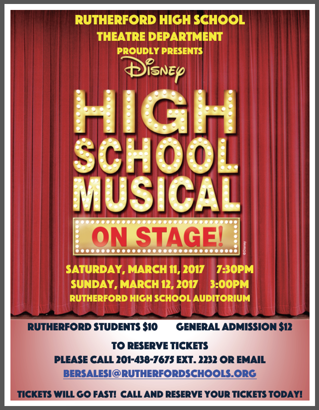 The Rutherford High School Spring Musical: Disney's High School Musical! The show will be presented on Saturday, March 11th, 2017 at 7:30pm and Sunday, March 12th, 2017 at 3:00pm. Please click on the poster below for more information. To reserve tickets, please call or email Mr. Brian Ersalesi at 201-438-7675 ext. 2232 or bersalesi@rutherfordschools.org. … [Read more...] about High School Musical!