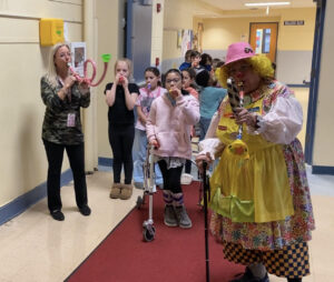 Gilly, the Caring Clown, came for a visit on our Day of Play! Gilly helped Ms. Monochello’s second-grade class make original kazoos and led the students as they paraded the halls playing music. When the band learned it was Ms. Jimenez, the school secretary’s birthday, they serenaded her with the Happy Birthday song.