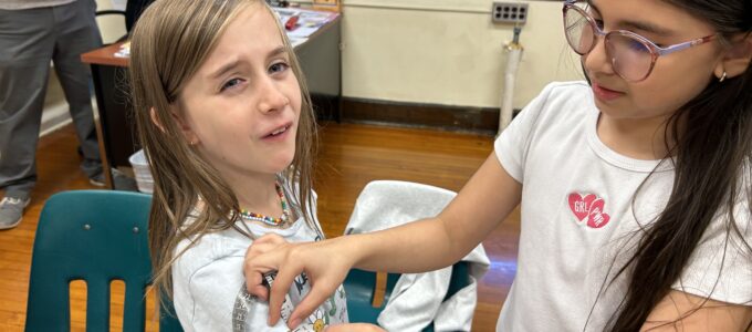 Students in Mr. Vaccaro's and Mrs. Barone's 4th Grade Science class are learning how the skeletal and muscular systems work together so the body can more. They took turns using a tape measure to note and record the length and width of the triceps and biceps while contracted, and relaxed. They compared the measurements to discuss how the muscles change as they move, and they composed a written description of how the muscles change as they pull on the bone to move the arm.