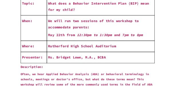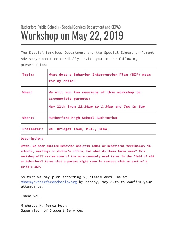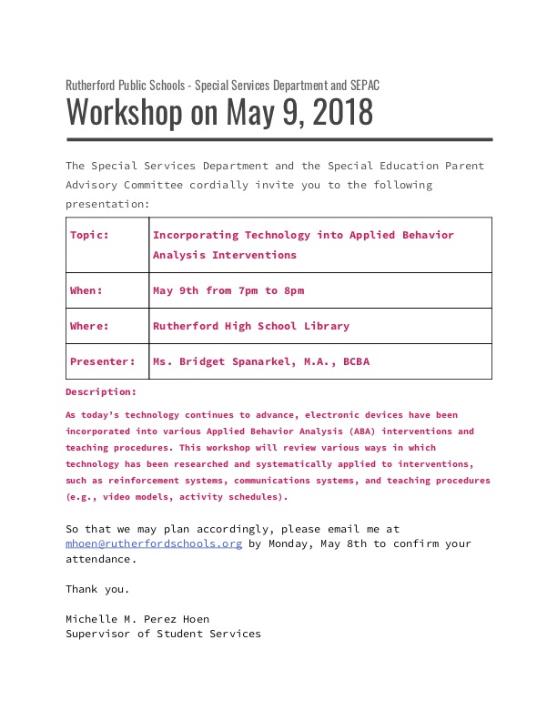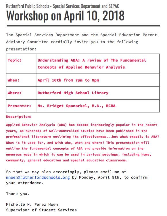We are pleased to announce our next workshop being held in the Rutherford High School Library on April 10, 2018 from 7-8pm - Understanding ABA: A review of The Fundamental Concepts of Applied Behavior Analysis. So that we may plan accordingly, please email me at mhoen@rutherfordschools.org by Monday, April 9th, to confirm your attendance. See attached for more information. A SEPAC meeting will be held prior the the workshop from 6-7pm. … [Read more...] about Understanding ABA Workshop