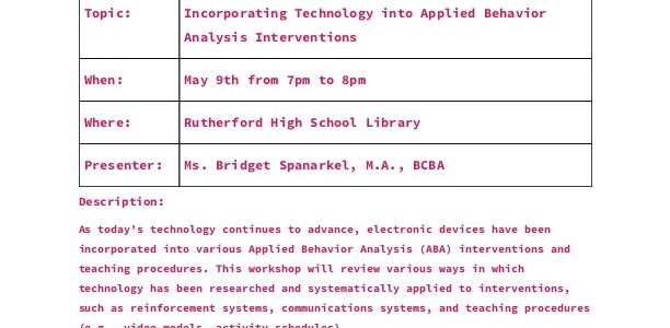 The Special Services Department and the Special Education Parent Advisory Committee cordially invite you to the following presentation. Incorporating Technology into Applied Behavior Analysis Interventions on May 9th from 7pm to 8pm at the RHS Library presented by Ms. Bridget Spanarkel, M.A., BCBA. … [Read more...] about Incorporating Technology into Applied Behavior Analysis Interventions