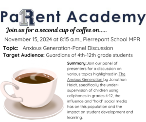 Parent Academy: Anxious Generation-Panel Discussion November 11, 2024 by Parent Academy We hope you are able to join us this Friday, November 15, at Pierrepont School, in the Multi-Purpose Room at 8:15 am!